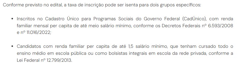 Os candidatos que desejam prestar o vestibular próprio da Unifal (Universidade Federal de Alfenas) e que se enquadram nos critérios definidos no edital podem solicitar isenção da taxa de inscrição. O valor da taxa é de R$ 162,10, e os pedidos de isenção podem ser feitos até o dia 2 de agosto, por meio do site do Cebraspe, banca organizadora do processo seletivo.
