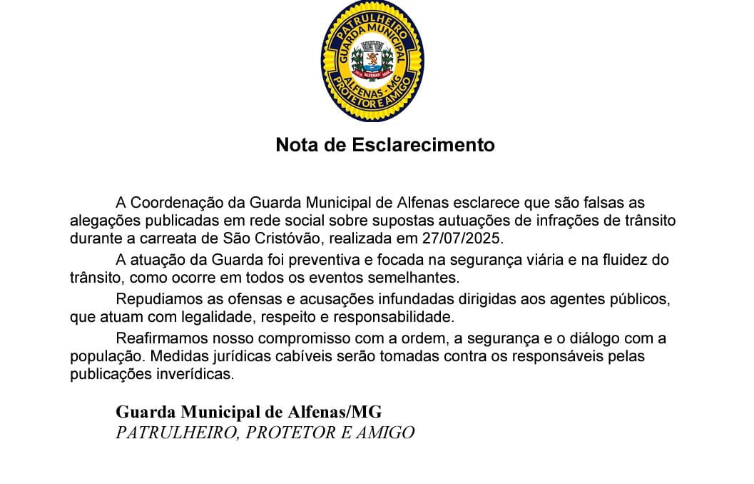 A nota informa ainda que a Coordenação da GCM repudia as acusações infundadas e que medidas jurídicas cabíveis serão tomadas contra os responsáveis pelas publicações inverídicas.