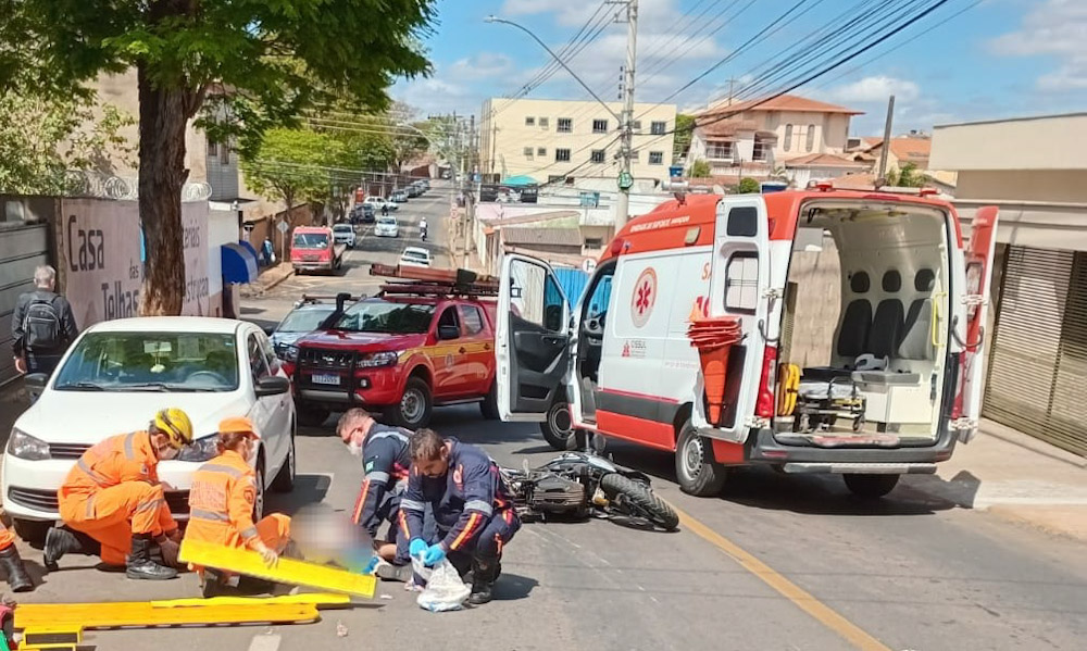 Um motociclista sofreu uma fratura exposta na perna após se envolver em um acidente na manhã desta segunda-feira, no cruzamento da Rua Alterosa com a Rua João Fonseca, em Alfenas. A colisão entre a moto e um carro aconteceu por volta das 11h.