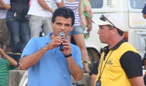 O prefeito Luizinho, ao lado do locutor Christian Mascary, ao anunciar a pista de bicicross
