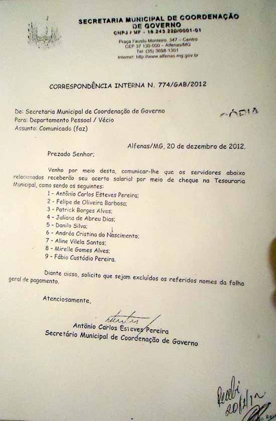 A correspondência interna nº 774/GAB/2012 foi encaminhada pelo ex-secretário de Coordenação de Governo ao Departamento Pessoal para que os nove nomes da lista fossem excluídos da lista geral de pagamentos. O motivo é que os mesmos receberiam em cheque diretamente na Tesouraria do Município.