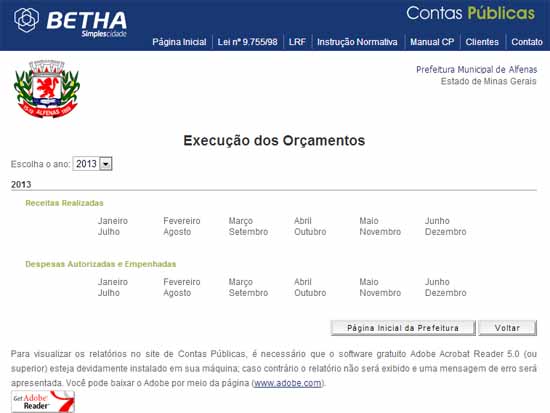 Imagem do site da prefeitura de Alfenas, onde - segunda a denúncia - não constam as informações atualizadas sobre a execução orçamentária e financeira do município