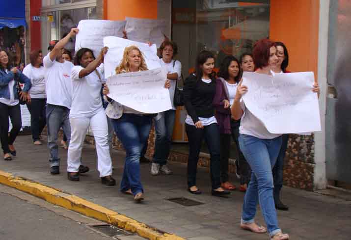 Com cartazes, um grupo de funcionárias saiu do RP, caminhou pelo centro até a Câmara Municipal, onde uma comissão se reuniu com Maurílio Peloso. Durante o trajeto, elas gritavam: “Por que parou? Porque o Maurílio não pagou”.