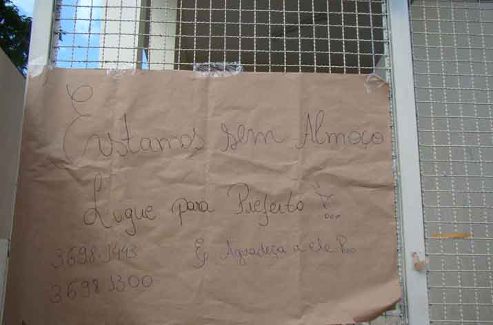 O RP ficou fechado na noite de segunda-feira, quando um grupo de funcionárias foi à Câmara Municipal, e no almoço desta terça-feira. Na entrada do RP, foi colocado um cartaz com a seguinte frase: “Estamos sem almoço. Ligue para o prefeito e agradeça a ele”.