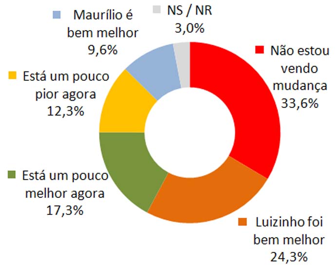 Dos 36,6% que apontaram a gestão anterior como mais positiva, 24,3% responderam que a administração do ex-prefeito Luiz Antônio da Silva foi “bem melhor”. Outros 12,3% afirmaram que “está um pouco pior agora”.