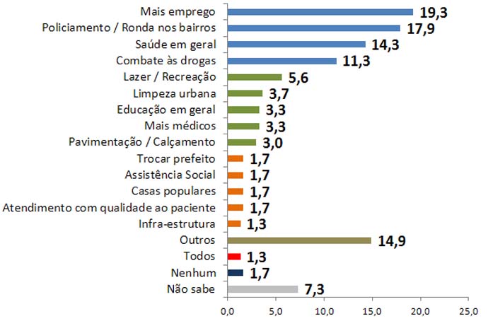 Os entrevistados foram questionados sobre as prioridades dos bairros: as mais citadas são policiamento (23,9%), combate às drogas (21,6%) e limpeza urbana (12,6%). Em relação às prioridades da “cidade como um todo”, a mais citada é geração de empregos, com 19,3%, seguida por policiamento (17,9%), saúde (14,3%) e combate às drogas (11,3%).