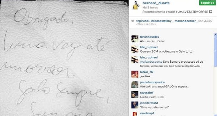 Na imagem, o ex-jogador do Galo mostrou um guardanapo com uma mensagem aparentemente escrita por um torcedor alvinegro que mostrou o carinho com o atacante brasileiro. Obrigado, uma vez até morrer. Galo sempre, sempre! foi a frase recebida por Bernard.