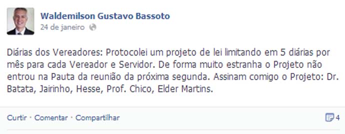 Seis vereadores assinam o projeto. Na sexta-feira, um dos autores da proposta, o vereador Waldemilson Bassoto (Padre Waldemilson/PROS), utilizou seu perfil nas redes sociais para informar que o projeto já havia sido protocolado, mas não foi incluído na pauta da sessão legislativa dessa segunda-feira para leitura oficial. “De forma muito estranha o projeto não entrou na pauta da próxima reunião”, postou.