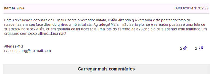 “Estou recebendo dezenas de E-mails sobre o vereador Batata, estão dizendo q o vereador esta postando fotos de nascentes em seu face dizendo q virou ambientalista. Agradeço! Mais... não seria pior se o vereador postasse uma foto de sua xxxxxx no face? Aliás, quem gostaria de ter acesso a uma foto do cérebro dele? Acho q o cara apenas esta tentando um orgasmo com xxxxxx alheio...Liga não! (sic)”, diz Itamar no comentário.