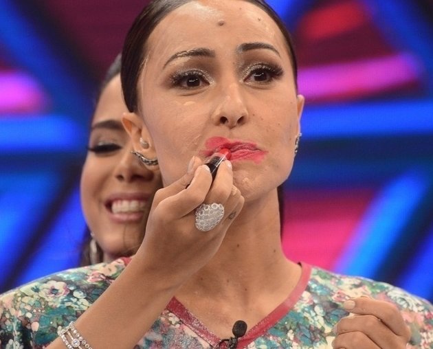Sabrina Sato é "maquiada" por Anitta na estreia do programa. Foto: Divulgação/Record