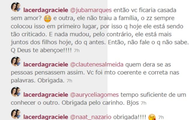 Para uma das internautas, Graciele defendeu Zezé e a escolha de se separar de Zilu. "Então você ficaria casada sem amor? E outra: ele não traiu a família e sempre colocou isso em primeiro lugar. Por isso, hoje está sendo tão criticado. E nada mudou, pelo contrário. Ele está mais junto dos filhos do que antes. Então, não fale o que não sabe. Que Deus te abençoe!", escreveu.