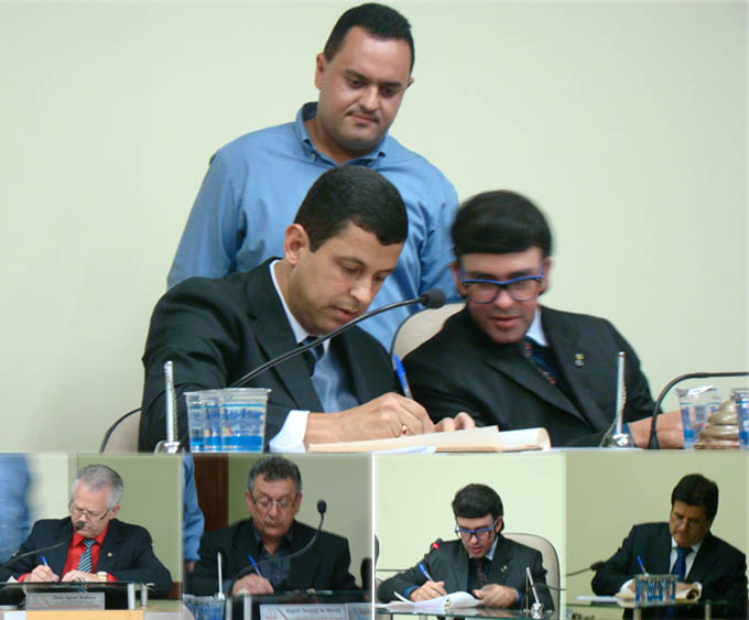 Acima, ao lado de Sonzinho e com o assessor de plenário Wendel Murad ao fundo, Enéias é empossado na presidência. Abaixo, os demais integrantes da nova Mesa Diretora (Fotos: Alessandro Emergente)