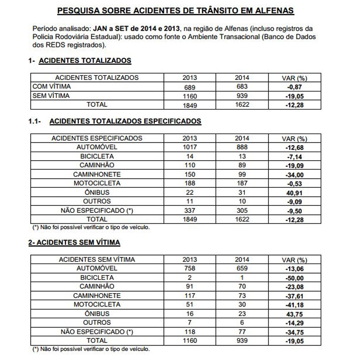 De janeiro a setembro do ano passado houve uma queda no número de acidentes no trânsito de Alfenas. A comparação foi feita com o mesmo período de 2013 e os dados, da PM (Polícia Militar), foram apresentados durante uma audiência pública realizada na última quinta-feira (26).