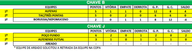 Já o Alfenense de Futsal, sob o comando técnico de Luciano Assumpção (Arara), foi o segundo colocado (com 3 pontos) da Chave J, que teve Poço Fundo na primeira colocação, com 6 pontos. Areado desistiu da competição.