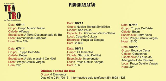 A 5ª Mostra de Teatro de Rua começa nesta quinta-feira em Alfenas e vai até domingo com diversas apresentações artísticas. A iniciativa do Centro de Pesquisa Teatral Mundo (Cepetem) é em parceria com a Secretaria Municipal de Educação e Cultura.