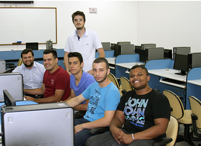 Acima, o professor Maurício Moreira Júnior (em pé) e os acadêmicos Carlos, Gabriel, Maycon, João e Guilherme (Foto: Galvone Oliveira/Unifenas)