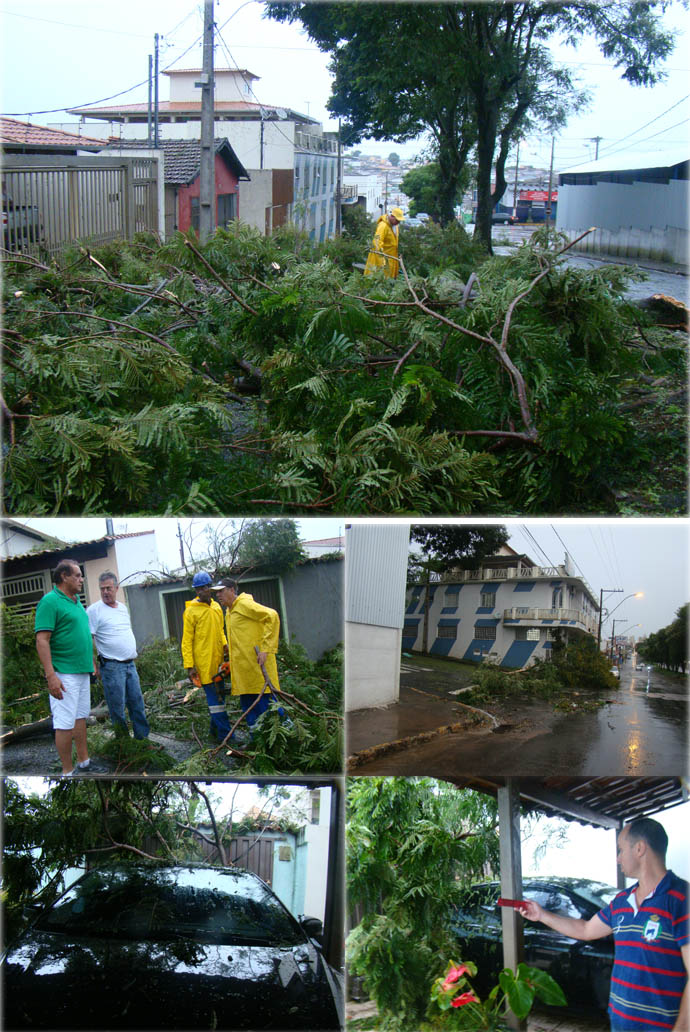 Acima, a avenida Machaod de Assis (Jd São Carlos). O secretário de Meio Ambiente, John Strauss, avalia a situação logo após o temporal e morador mostra prejuízo depois que galhos atingiram o seu carro, que estava na garagem da residência