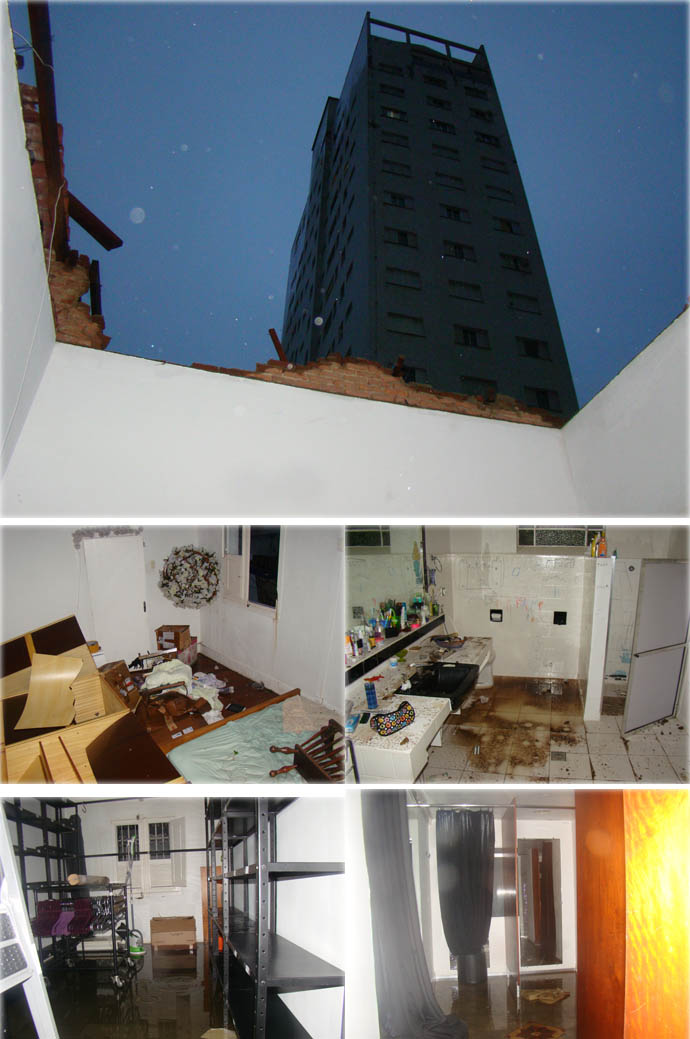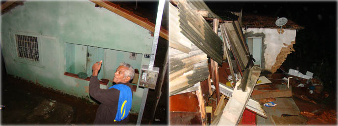 Acima, morador mostra a sua residência, na rua Alberto de Oliveira, que teve uma parte destruída. Abaixo, o temporal arrancou o telhado de uma residência no centro de Alfenas (avenida São José) e a água inundou a loja que fica embaixo da casa, a loja Silvia Ribeiro