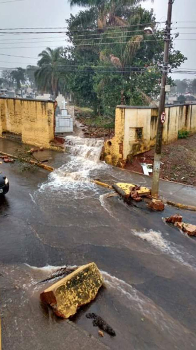 A chuva de domingo derrubou parte do muro do Segundo Cemitério, no Jardim Boa Esperança (Foto: WhatsApp/Reprodução)