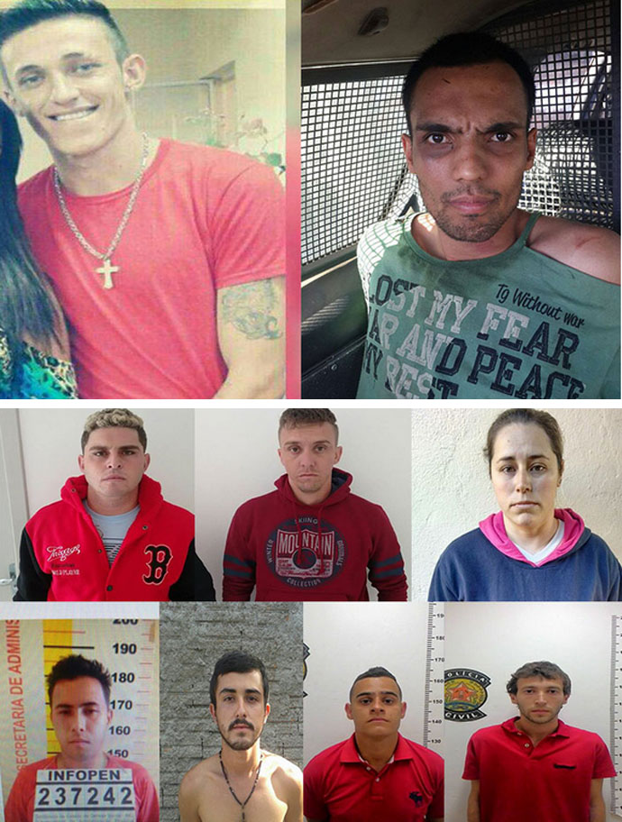 Acima, os suspeitos Maxssuel Florêncio e Marcos José Quintino (blusa vermelha) foram presos pela Polícia Civil após determinação da Comarca de Areado. Abaixo, os dois foragidos em destaque e todos os suspeitos que já foram presos (Fotos: Polícia Civil)