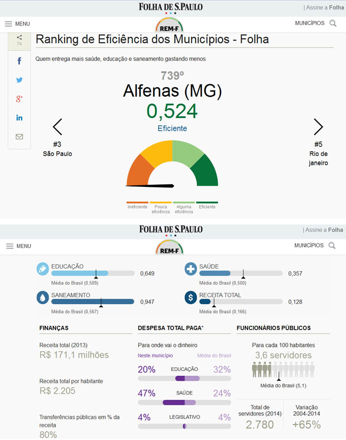 O Ranking de Eficiência dos Municípios–Folha (REM-F) apontou Alfenas com a classificação “alguma eficiência” num estudo que mede a eficiência das gestões municipais. Porém, a área da saúde, um dos três indicadores usado na pesquisa, apresenta índice abaixo do tido como recomendável para alcançar a eficiência na gestão e foi o indicador que puxou para baixo a nota final. O ranking nacional aponta Alfenas na 739ª posição.