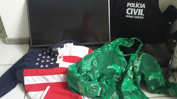 Materiais apreendidos: uma TV e roupas que podem ter sido usadas em assaltos recentes.