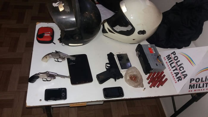 Na residência e com os autores foram encontrados capacetes, tabletes, revolveres calibre 22 e réplicas simulando armas de fogo utilizadas em assaltos.