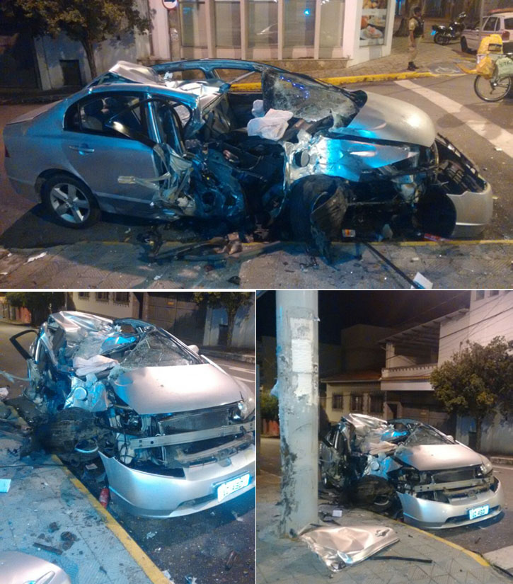 O motorista de um Honda Civic perdeu o controle da direção e acabou batendo em uma árvore e em um poste de iluminação na madrugada de sábado. O acidente foi na esquina da rua São José com a rua Gaspar Lopes, no centro de Alfenas. O carro ficou bastante destruído.