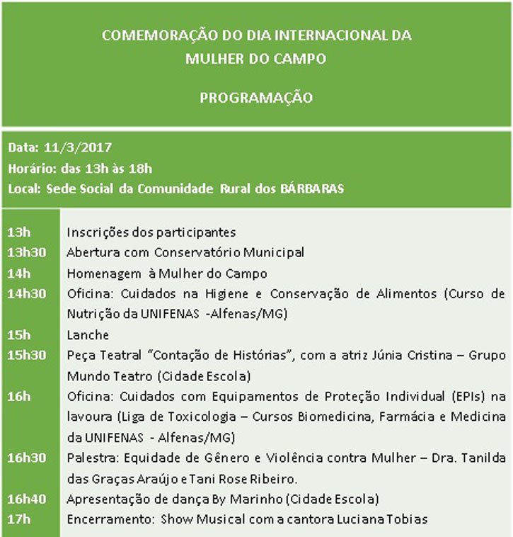 O Dia Internacional da Mulher do Campo será celebrado na Comunidade dos Bárbaras com várias atividades. Trata-se de uma parceria entre a Secretaria Municipal de Agricultura, a Unifenas (Universidade José do Rosário Velano), a Emater/MG (Empresa de Assistência Técnica e Extensão Rural do Estado de Minas Gerais) e o Conselho Comunitário do Desenvolvimento Bárbaras, e a Associação de Mulheres Agricultoras Artesãs da Comunidade Rural dos Bárbaras (Amaacorb).