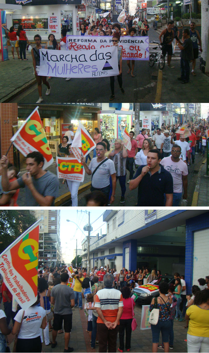 Os manifestantes fizeram uma concentração em frente o Centro Vivencial e, na sequência, seguiram até a Praça Getúlio Vargas, contornando o local. Como noticiou o Alfenas Hoje, na quinta-feira, a “Marcha do dia 31” é um protesto contra as reformas promovidas pelo presidente Michel Temer (PMDB), vista pelos movimentos sociais como um retrocesso para as conquistas dos trabalhadores e da população carente.
