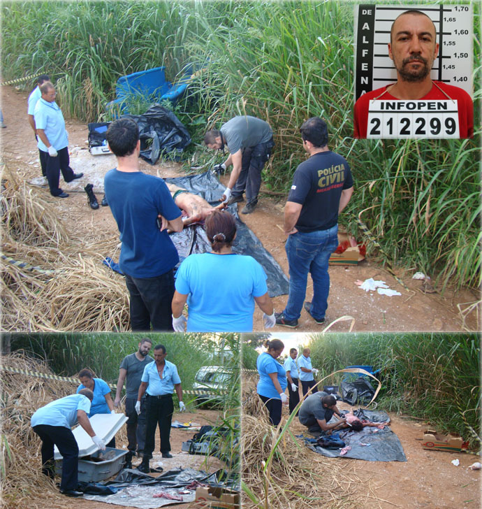 O corpo da vítima (no detalhe) foi localizado numa estrada de terra. Acima, perícia sendo realizada pouco antes do corpo ser encaminhado ao Serviço de Verificação de Óbito (Fotos: Alessandro Emergente/Arquivo)
