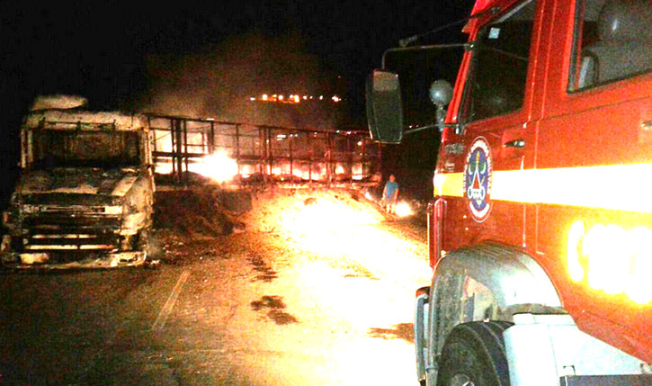 O fato foi registrado na noite de terça-feira no km 127 da rodovia BR 491, em Monte Belo. A causa provável, segundo o condutor, foi que o veículo deu uma pane e desligou, vindo a sair muita fumaça do painel. Depois disso, o incêndio se espalhou rapidamente pelo veículo. A carreta transportava 30.000 kg de café. Abaixo, foto divulgada pelo Corpo de Bombeiros.