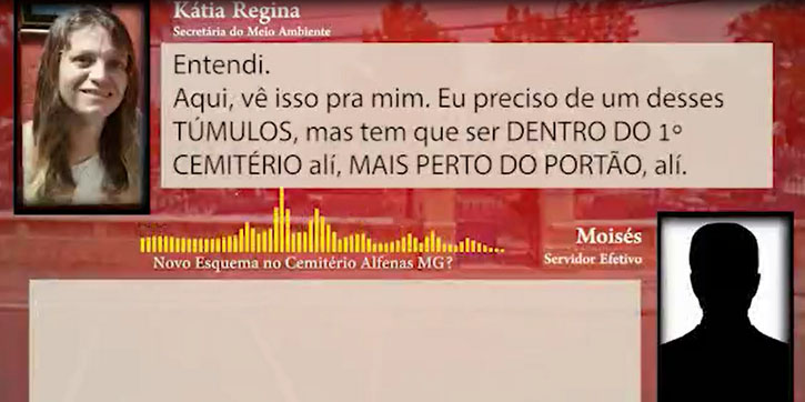 Em um terceiro áudio, Kátia liga para o telefone do servidor, mas quem atende é outra pessoa e essa informa que Marques saiu para pescar. Nessa ligação, a secretária executiva, que já sabendo das gravações, diz que o túmulo foi separado para “uma pessoa muito influente, que muito fez por Alfenas”.