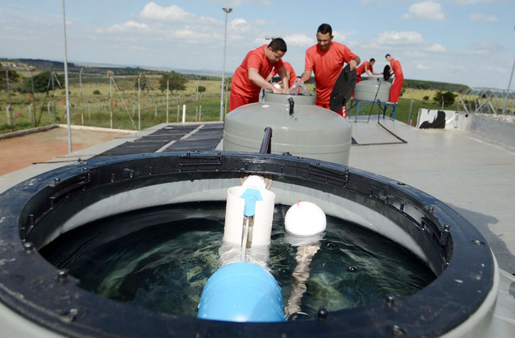 Foram instalados 22 sistemas de 1.000 litros, sendo um para cada cela. A manutenção será feita pelos próprios detentos.