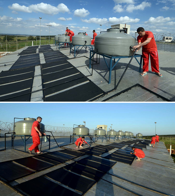 O curso e as obras começaram em dezembro de 2016 e terminaram no mês passado. A carga horária foi de 198 horas, com 6 horas de aula teórica e o restante de atividades práticas. Foram instalados 22 sistemas de 1.000 litros. Um para cada cela. A manutenção será feita pelos próprios detentos, que se tornaram Técnicos Projetistas em Sistema de Aquecimento Solar.