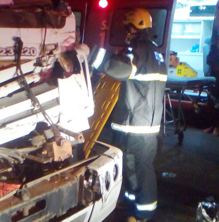 De acordo com o Corpo de Bombeiros, um dos caminhões colidiu na traseira do outro no km 14 da rodovia. Uma vítima ficou presa nas ferragens com múltiplas fraturas. Após a retirada dessa vítima pelos militares, uma unidade do Samu realizou o transporte até o Hospital Alzira Velano. Abaixo, foto divulgada pelo Corpo de Bombeiros.