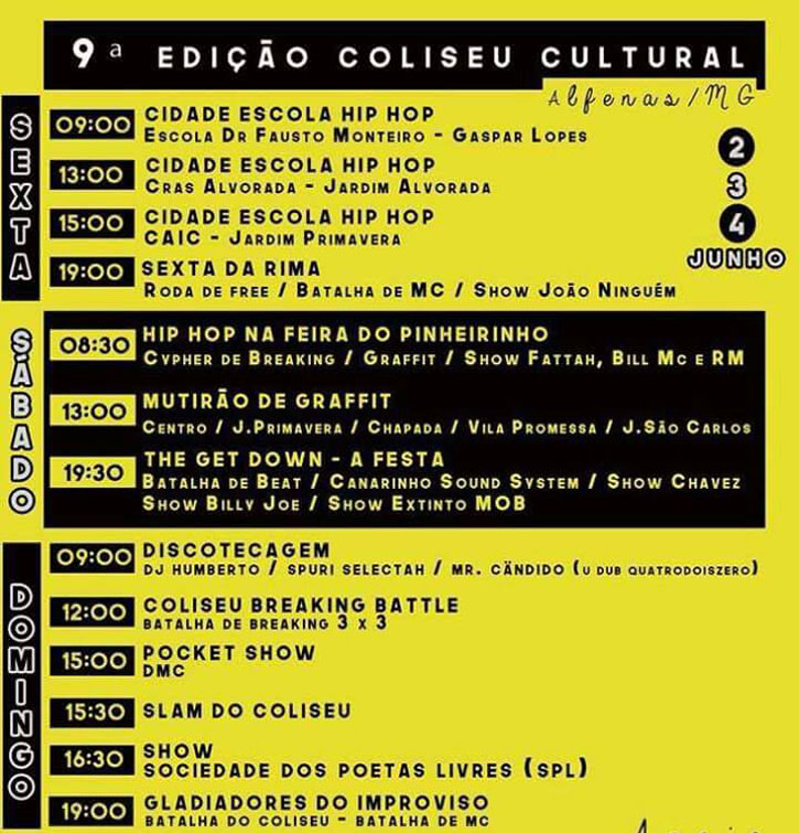 Nos dias 2, 3 e 4 de junho será realizada a 9ª edição do Coliseu Cultural – movimento que busca a união da cultura de rua e do movimento poético como ferramenta para intervenções socioculturais em Alfenas.