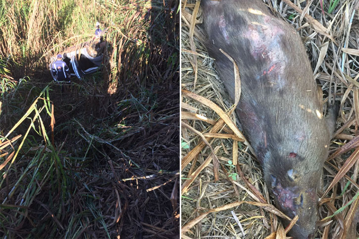 O corpo do empresário (na foto em detalhe) foi encontrado próximo ao veículo. Uma capivara foi encontrada morta próxima ao local do acidente (Fotos: Reprodução/Whatsapp)
