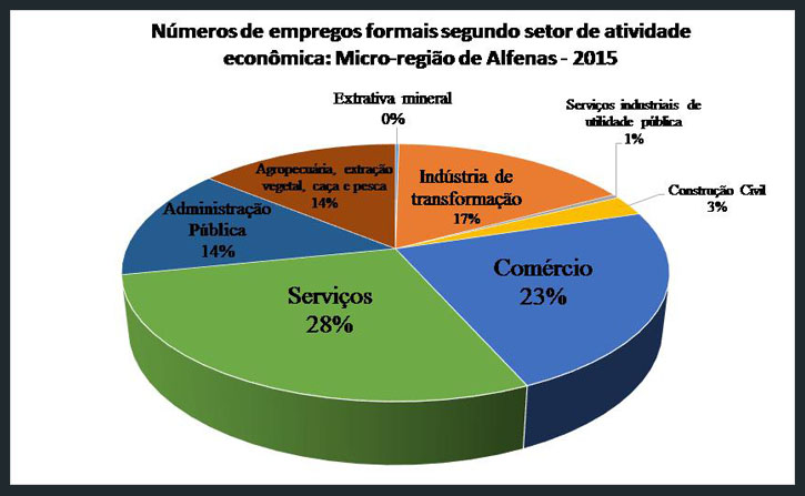 Tanto no Brasil quanto na microrregião de Alfenas o setor de serviços é o que mais emprega, tendo participação de 36% e 28% das vagas dos respectivos mercados de trabalho. Já o segundo setor com mais postos de trabalho é o comércio, com uma taxa de 20% para o Brasil, 23% para a microrregião e 26% na cidade de Alfenas.
