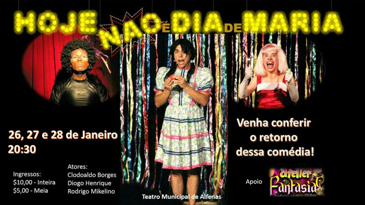 "Hoje não é de Maria", que está sendo apresentado neste final de semana no Teatro Municipal de Alfenas, é uma sátira da minissérie "Hoje é Dia de Maria", exibida pela TV Globo em 2005. O espetáculo está em cartaz de sexta-feira até domingo, sempre a partir das 20h30.