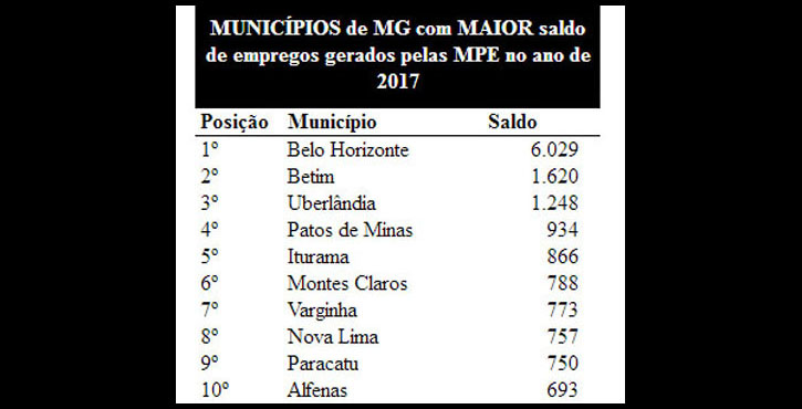 No ranking das cidades mineiras que tiveram o melhor desempenho na geração de emprego pelas MPE no ano passado, Belo Horizonte ficou em primeiro lugar com o saldo de 6.029 vagas. O resultado colocou a capital mineira na 3ª posição da lista das cidades onde as MPE mais geraram empregos no Brasil.
