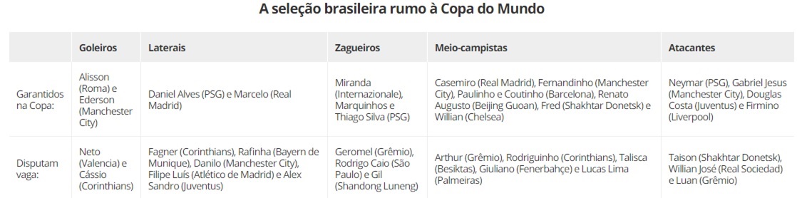 Paris Saint-Germain, derrotado nas oitavas, e Manchester City, nas quartas, deverão ser os maiores fornecedores da Seleção: da França virão Daniel Alves, Thiago Silva, Marquinhos e Neymar; da Inglaterra, Ederson, Fernandinho e Gabriel Jesus.