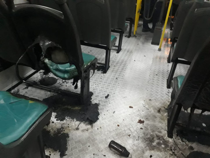 Os bombeiros chegaram a tempo de evitar o incêndio. Mas parte da estrutura interna do ônibus ficou danificada, como alguns bancos para passageiros. Na noite de domingo, dois ônibus foram incendiados. Abaixo, fotos registradas na noite de segunda-feira.