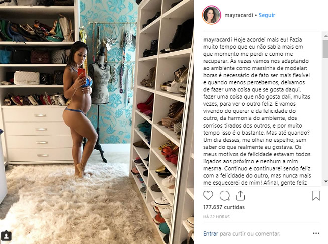 A ex-BBB Mayra Cardi exibiu para seus seguidores do Instagram seu barrigão de nove meses, e aproveitou para fazer um desabafo."Hoje acordei mais eu!