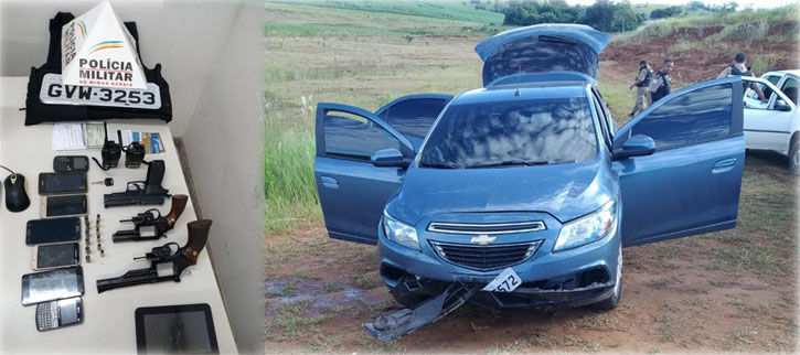Vários produtos foram apreendidos, como celulares e armas de fogo, além de uma placa de veículo. Os suspeitos foram presos após o carro usado na fuga chocou-se com uma pedra (Fotos: PM/Divulgação)