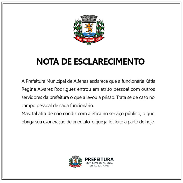 Em nota, encaminhada à imprensa, a Prefeitura de Alfenas manifestou que o episódio envolvendo Kátia e os demais servidores ocorreu no âmbito pessoal, mas que tal atitude não condiz com a ética no serviço público. Essa situação, segundo o governo, obrigou a adotar a exoneração de Kátia.
