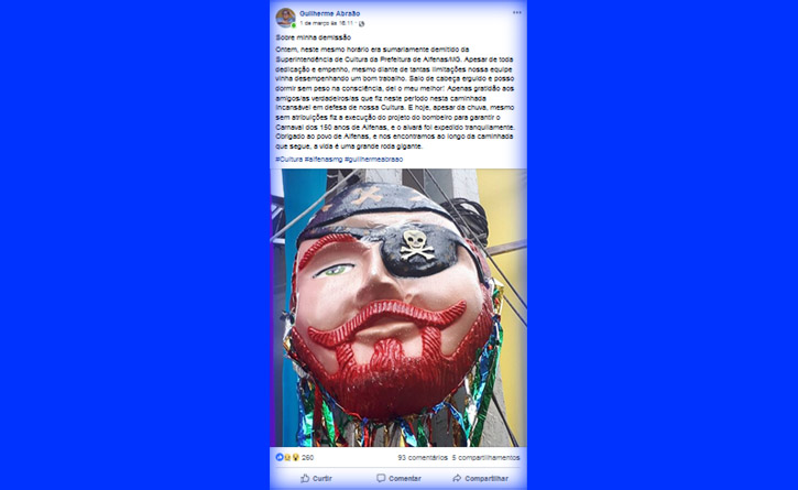 A inclusão do nome de Guilherme Abraão, ex-superintendente de Cultura, na lista dos mais de 170 exonerados gerou uma repercussão negativa nas redes sociais. Abraão recebeu manifestos de reconhecimento a sua atuação e contrários a sua exoneração.