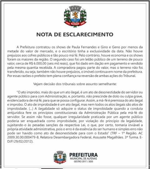 Em nota, a Prefeitura de Alfenas diz que os valores pagos na época ficaram a metade do mercado e, que o escritório contratado, tinha exclusividade na data. O item da exclusividade é o que originou a condenação. A dispensa da licitação é permitida, mas desde que a empresa tenha representação de exclusividade dos artistas. “Não houve prejuízo e tão pouco má fé”, diz a nota.