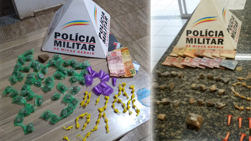 Em duas ocorrências, a Polícia Militar apreendeu mais de 60 pedras de crack, além cápsulas com cocaína e buchas de maconha. As ocorrências foram na sexta-feira e divulgadas pela PM nesta segunda-feira.
