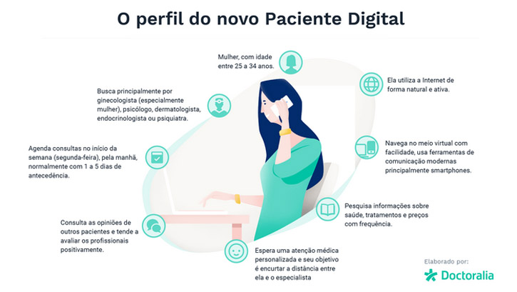 No estudo, a Doctoralia definiu o perfil do paciente digital brasileiro como sendo mulher, entre 25 e 34 anos de idade e com grande interesse em aconselhamento com ginecologistas, psicólogos, dermatologistas, endocrinologistas e psiquiatras. "Aqui no Brasil, as mulheres correspondem a 76% dos usuários da nossa plataforma. Acreditamos que isso acontece pelo fato de que elas ainda sejam responsáveis pela saúde do lar, marcando consultas não somente para si mesmas, mas também para os filhos, companheiros e outros parentes", pontua Lopes.